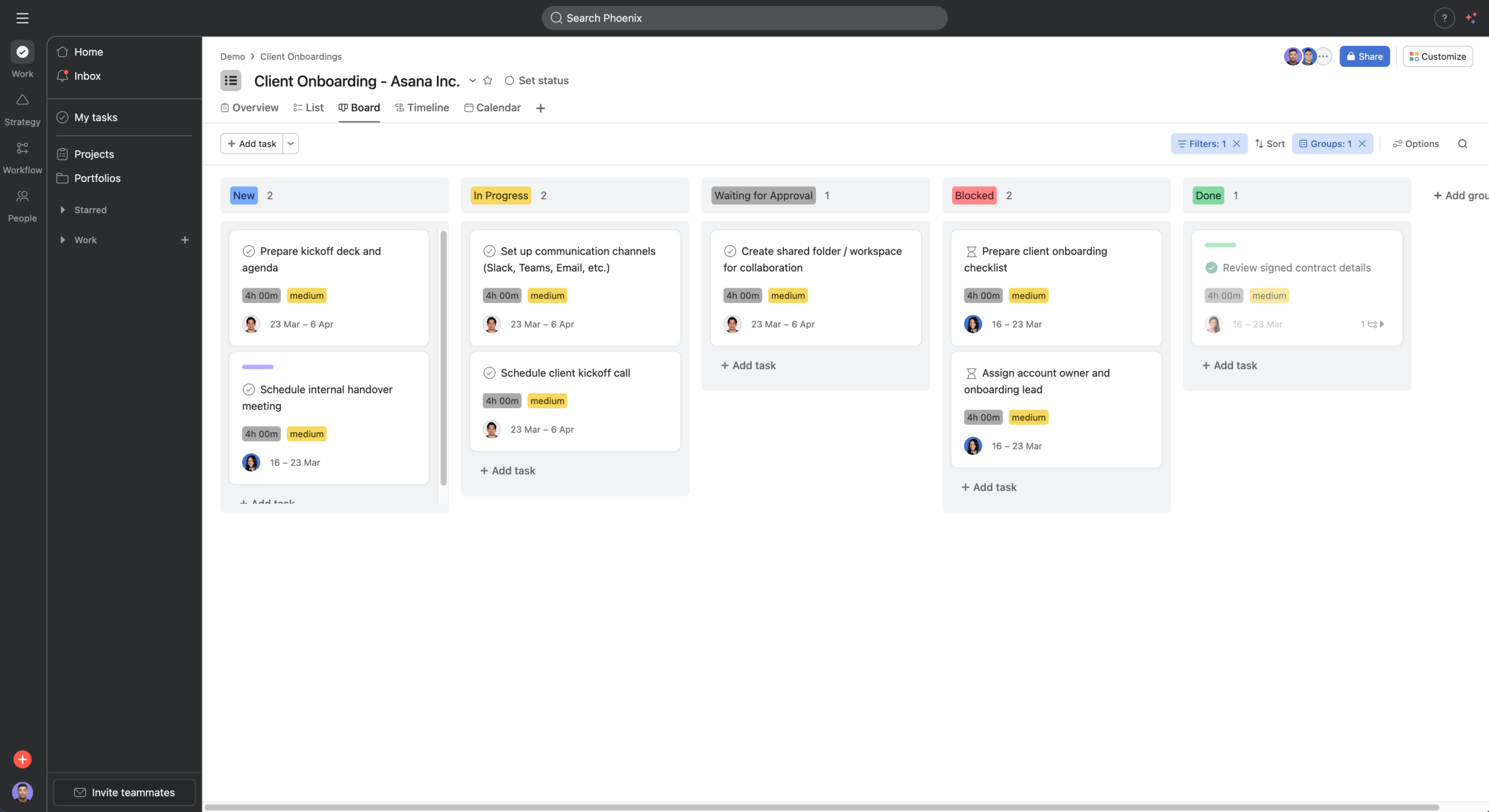 - eine Boardansicht, die Aufgaben anhand ihres Status in Kanban-Spalten darstellt