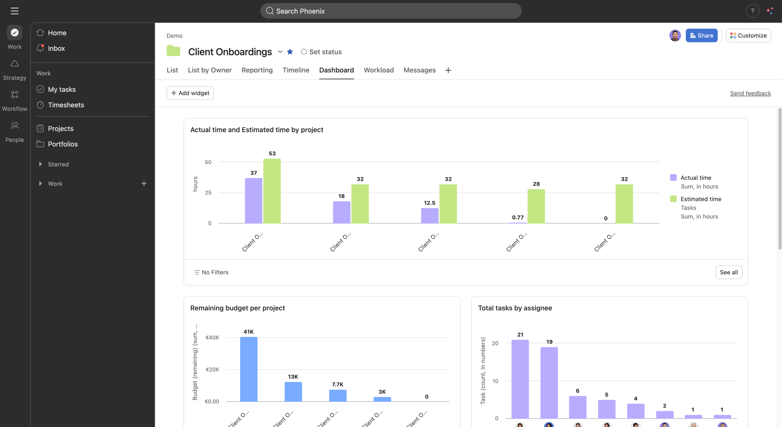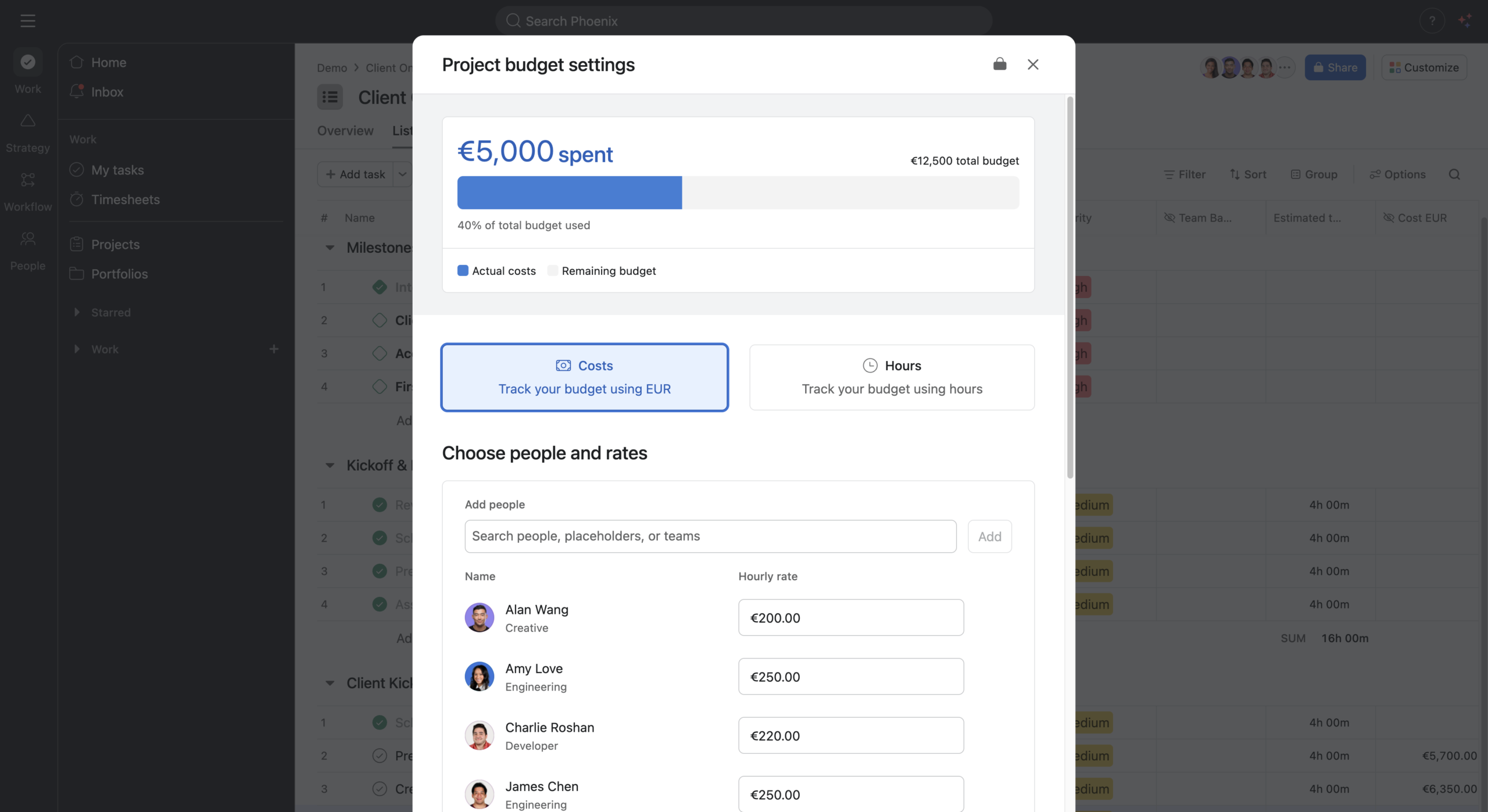 Mit dem Timesheets & Budgets Add-on können Stundensätze pro Teammitglied hinterlegt werden, differenziert nach Rolle oder Erfahrungslevel. Sobald jemand Zeit bucht, berechnet Asana die angefallenen Kosten und setzt sie ins Verhältnis zum geplanten Budget. Das Ergebnis ist ein Live-Dashboard mit verbrauchtem und verbleibendem Budget.